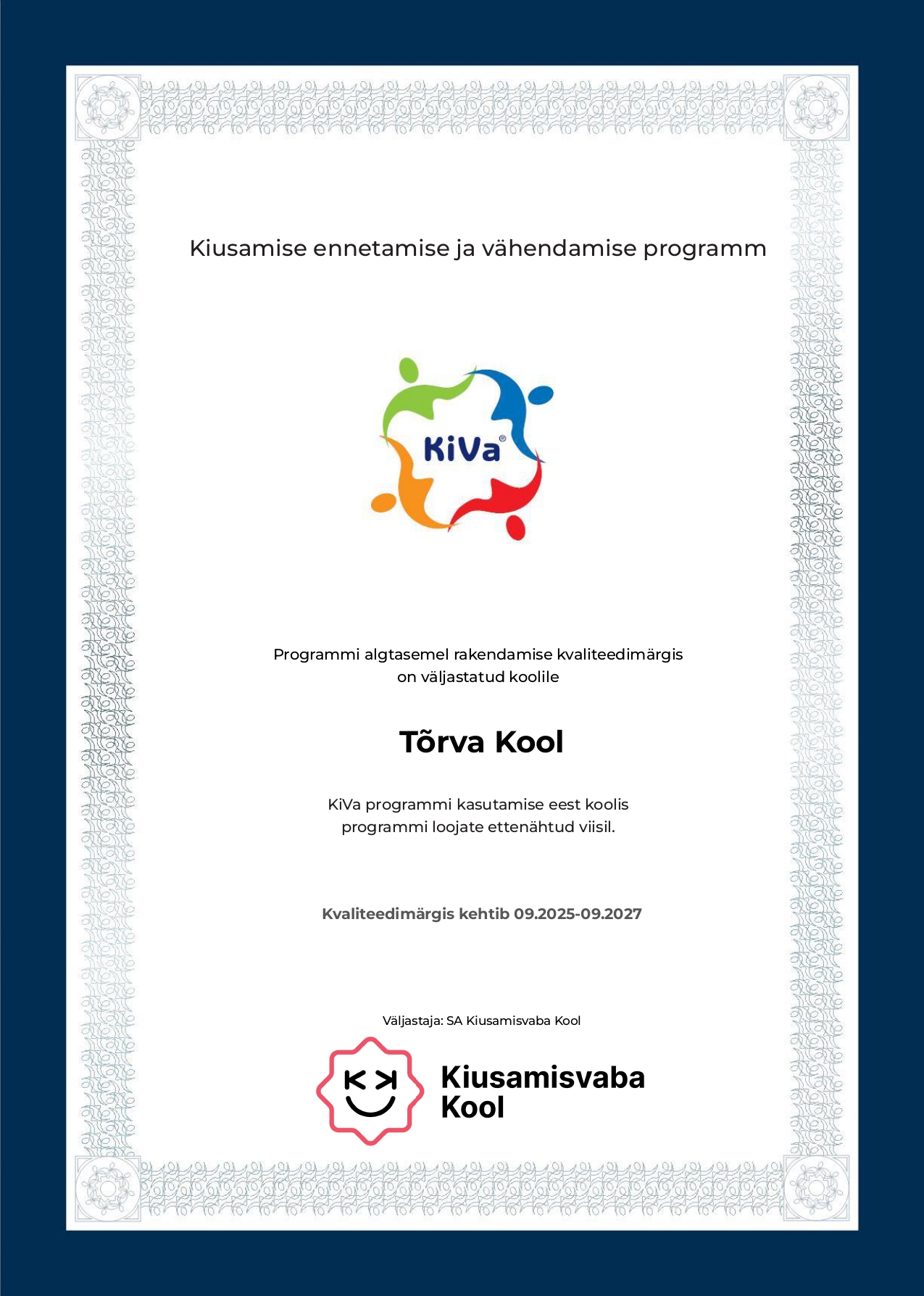 Meie kool sai algtaseme kvaliteedimärgise KiVa-programmi rakendamise eest.